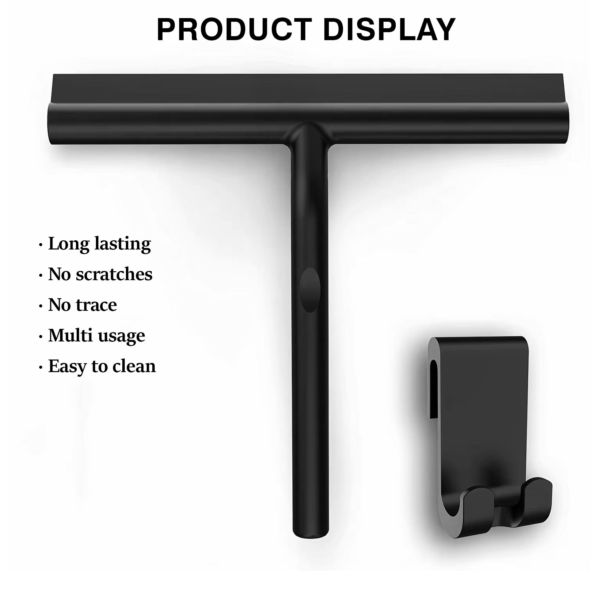 This high-quality non-telescoping squeegee is perfect for cleaning a variety of smooth surfaces like windows and glass shower doors. Designed with a sleek, black silicone-coated iron blade and an ergonomic handle, this squeegee ensures a comfortable and efficient cleaning experience. The silicone hook makes it easy to store and hang for quick access when needed. Ideal for both household and professional use, it provides a scratch-free, water-resistant, and durable solution for your cleaning needs.
