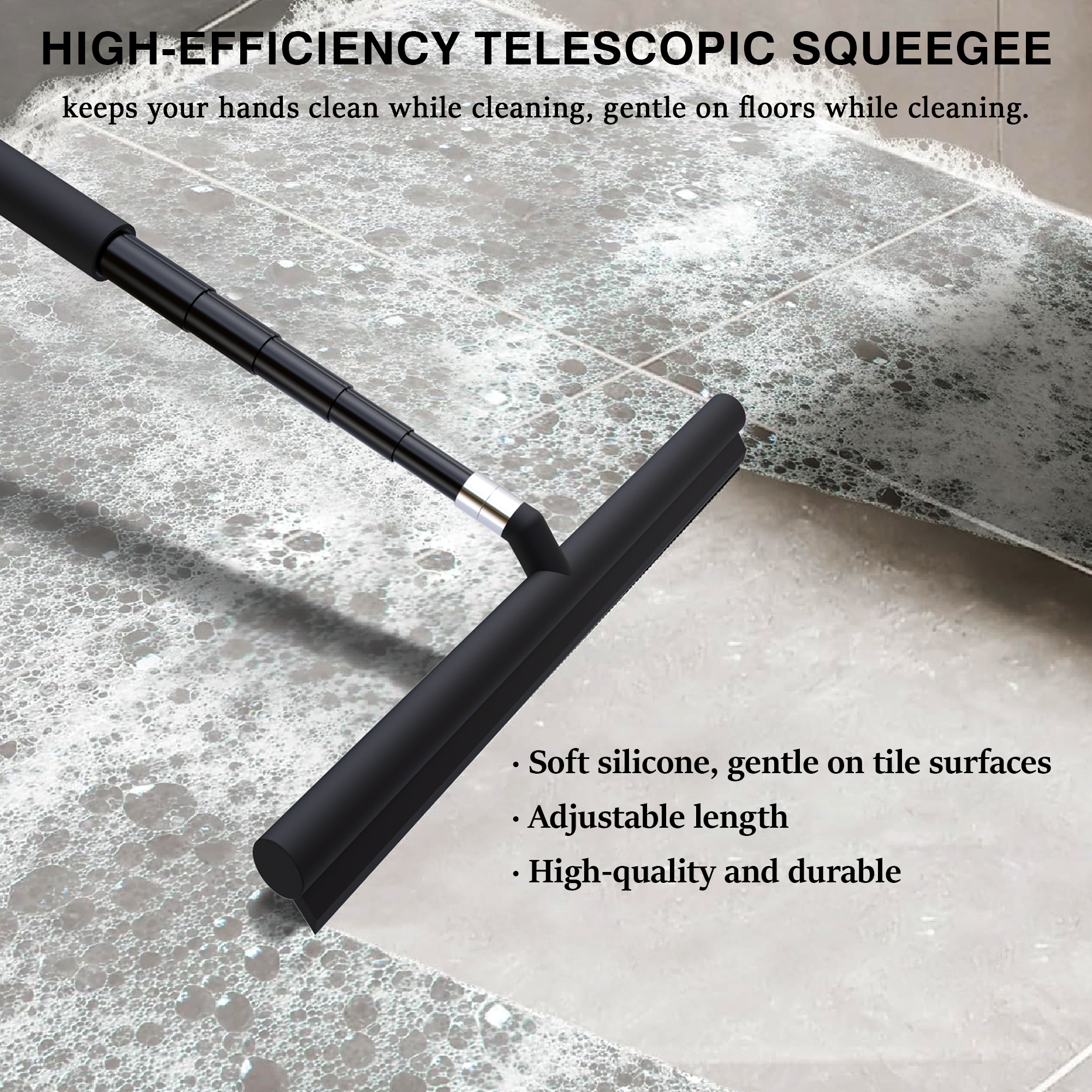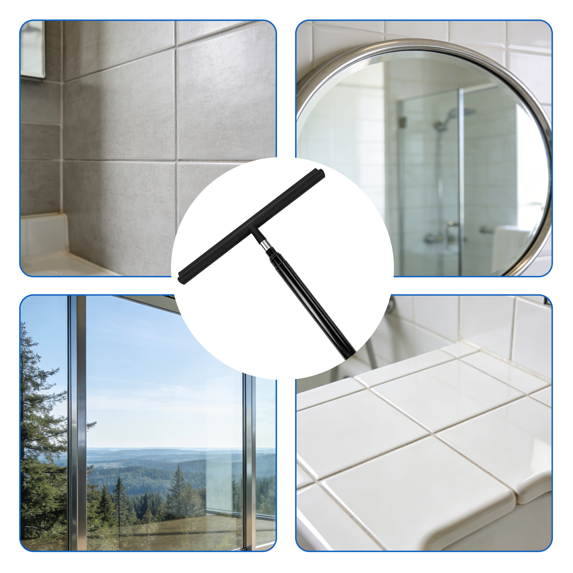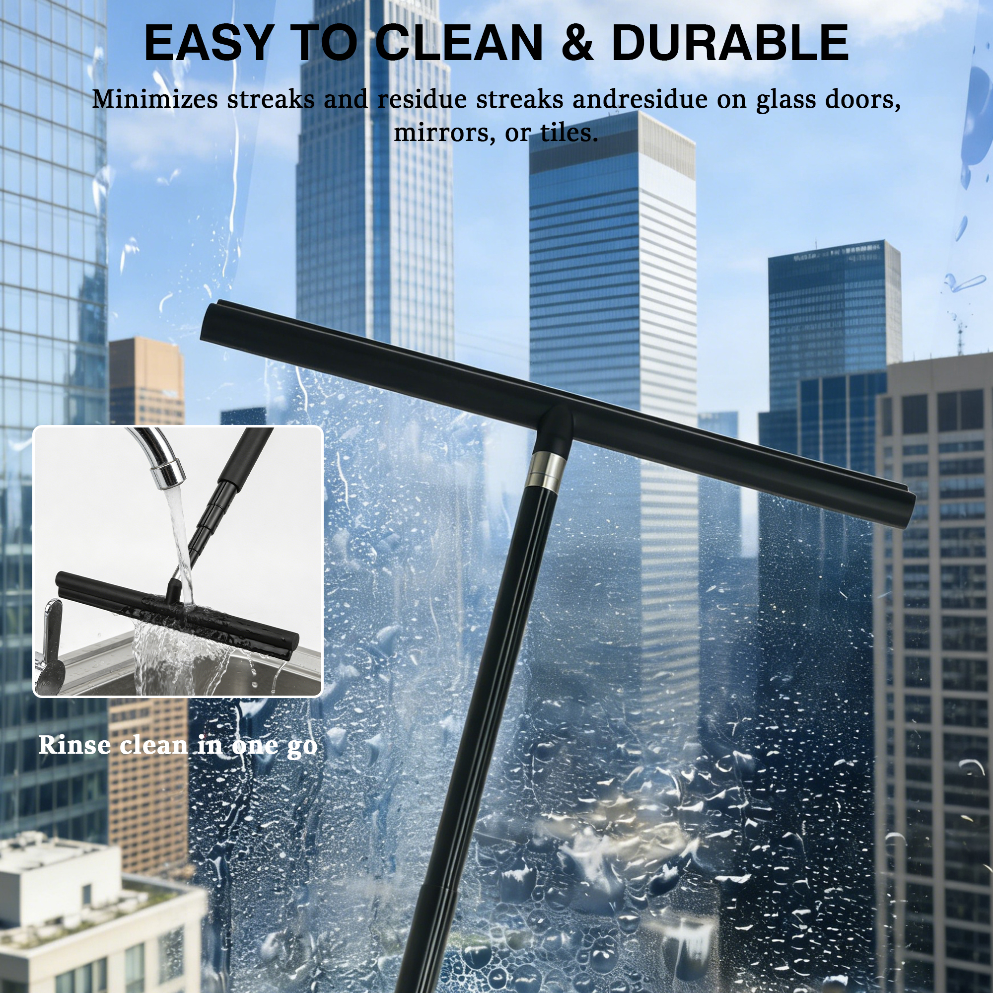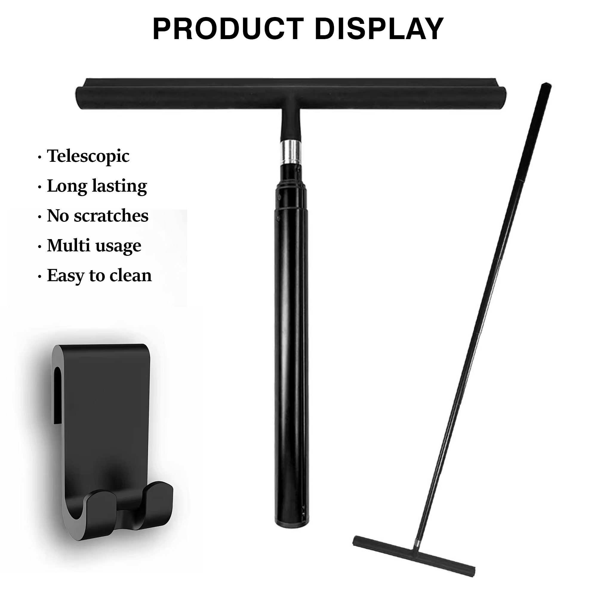 The telescopic squeegee is a versatile and durable cleaning tool designed for cleaning large glass surfaces, including windows and shower doors. Its extendable handle allows for easy reach, making it ideal for high windows or hard-to-reach areas. With a sleek black stainless steel blade and a comfortable telescopic handle, this squeegee is not only functional but also easy to store thanks to its silicone hook. This product offers excellent durability, water resistance, and scratch-free cleaning performance.