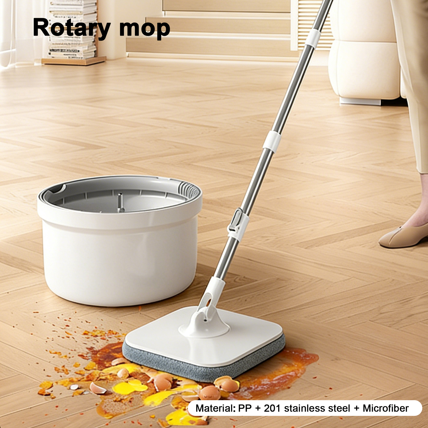The Rotary Mop combines superior quality and innovative design to deliver an effortless cleaning experience for your home. Made from high-grade materials such as PP, 201 stainless steel, and microfiber, this mop is designed for durability and ease of use.